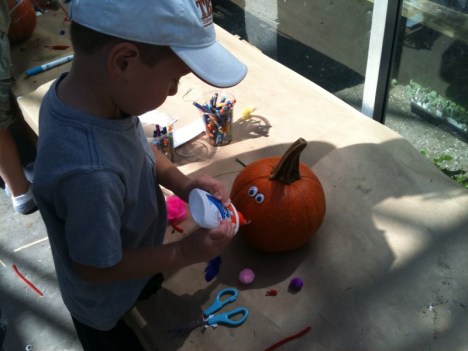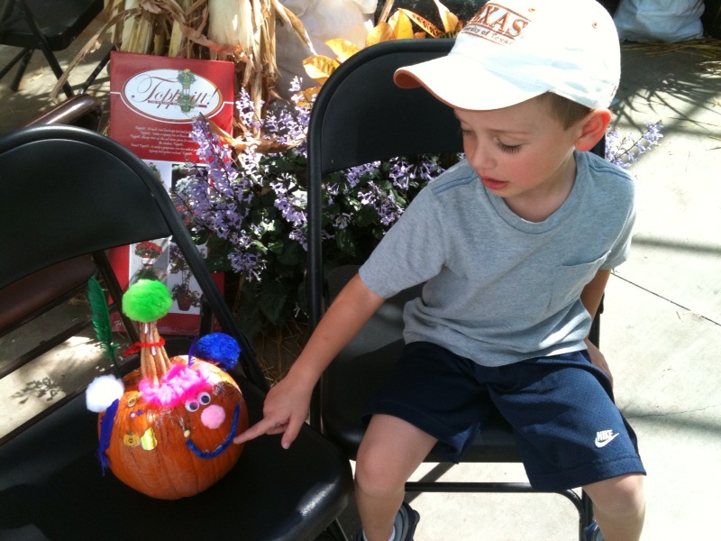 This weekend was a gorgeous weekend to be out and about. Grannie heard of an event Calloway Nursery was doing for kids so daddy and mommy decided to take me there. I got to design my own pumpkin. I didn’t carve it because my knife skills aren’t all that sharp these days, but I did get to glue stuff to the pumpkin and also color on it. It was all free so pretty cool.